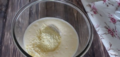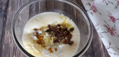 2. Добавьте мускатный орех, разрыхлитель, цедру лимона, кефир, промытый изюм и куркуму. Хорошо перемешайте и добавьте подсластитель по вкусу.